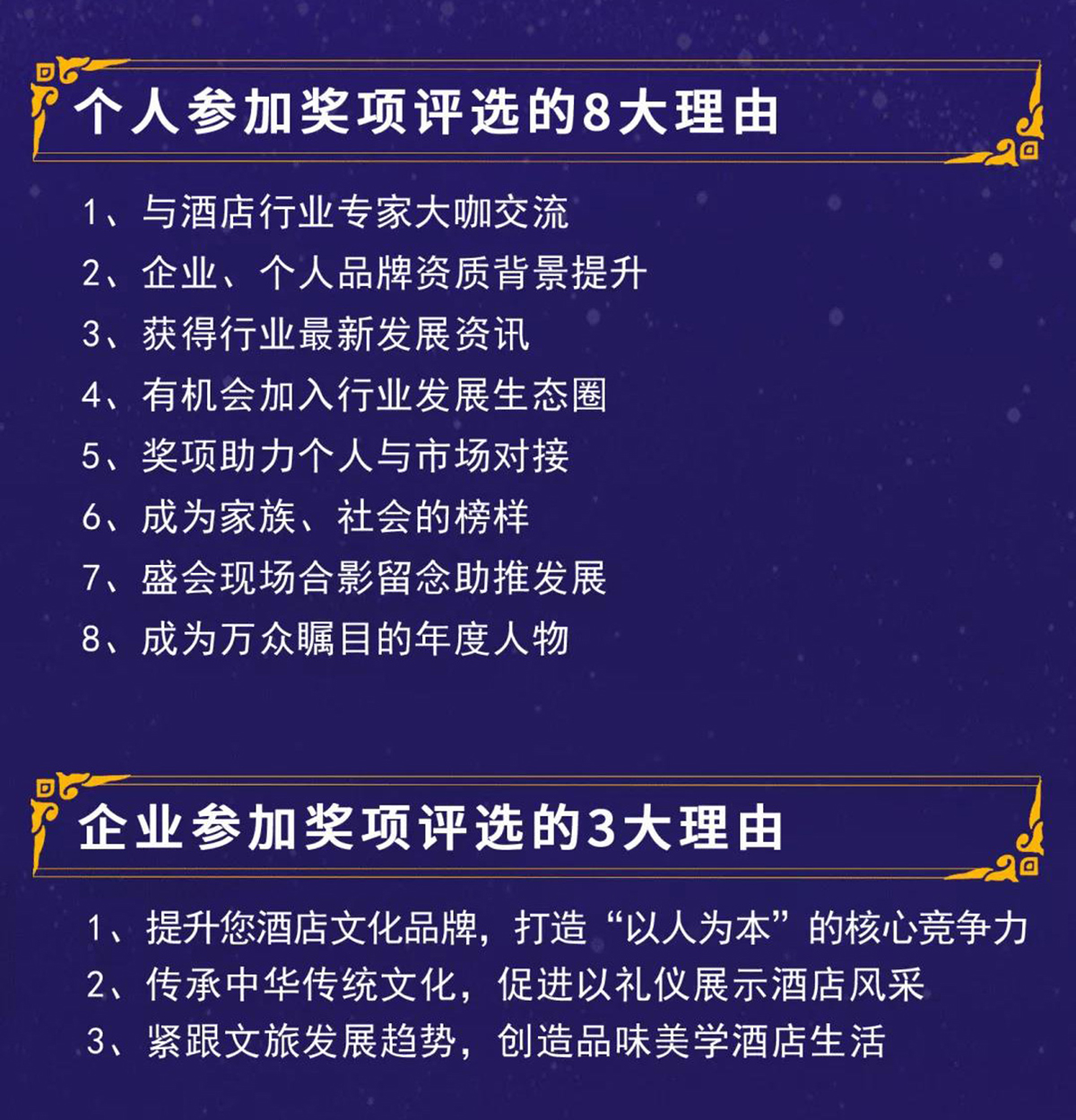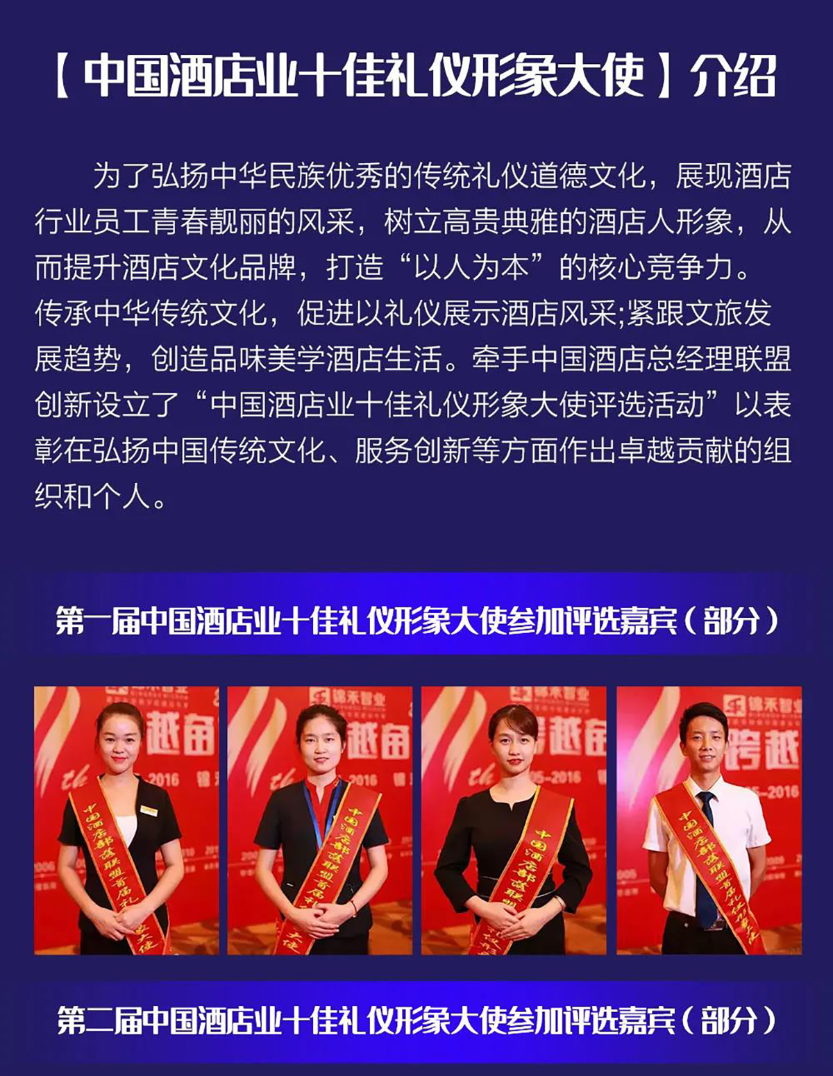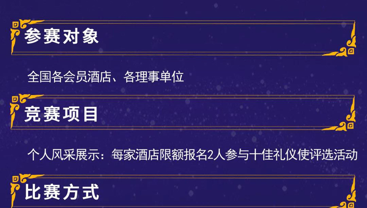 中国酒店业十佳礼仪形象大使评选活动一一为了弘扬中华民族优秀的传统礼仪道德文化,展现酒店行业员工青春靓丽的风采,树立高贵典雅的酒店人形象,从而提升酒店文化品牌,打造“以人为本”的核心竞争力;传承中华传统文化,促进以礼仪展示酒店风采;紧跟文旅发展趋势,创造品味美学酒店生活。